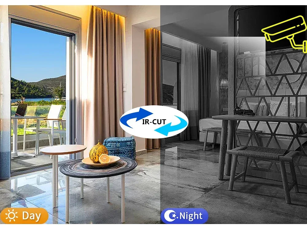 The smart IR-Cut filter switches automatically between day and night to reduce color cast in day time and enhance image brightness at night making sure you can get vivid surveillance footage from dawn to dark.