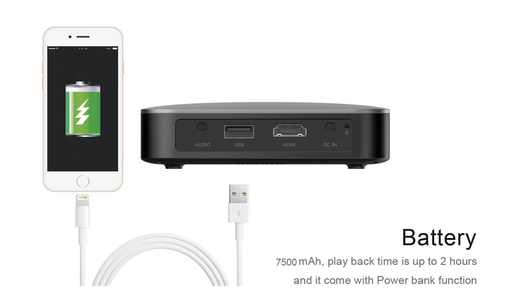 Battery capacity: 7500 mAh/up to 2.5 hours
