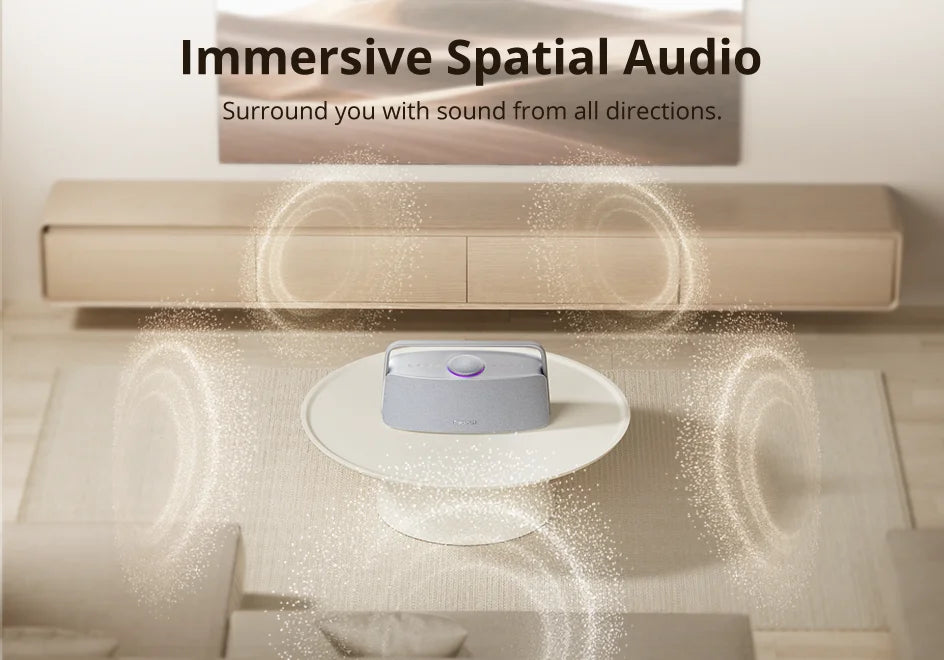 Bottom sub + 4 speakers create immersive 360° surround sound.
